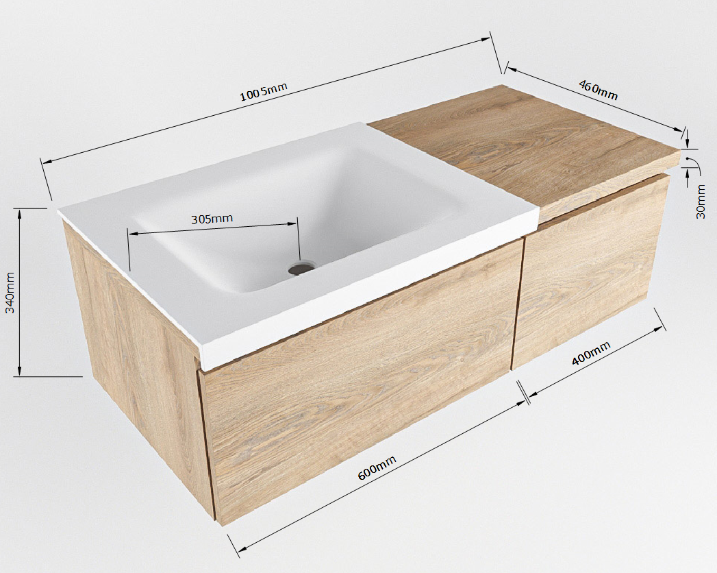 Naast zijn esthetische waarde, is dit badmeubel ook zeer functioneel. De ruime wastafel biedt voldoende ruimte voor dagelijkse verzorging, terwijl de lades zorgen voor een opgeruimde badkamer. De kraangaten zijn zorgvuldig ontworpen voor gemakkelijke installatie.