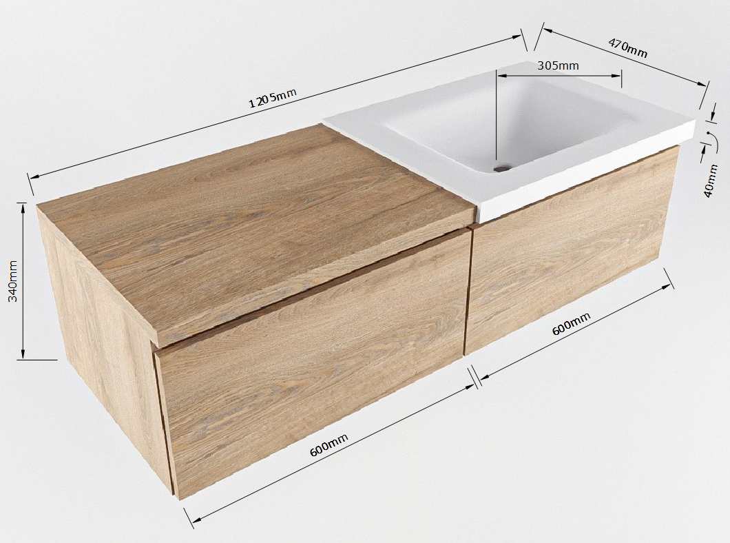 MONDIAZ BUKLA 120cm badmeubel met module 60 kleur Washed Oak met 2 lades. Wastafel CLOUD rechts 0 kraangaten kleur Talc.