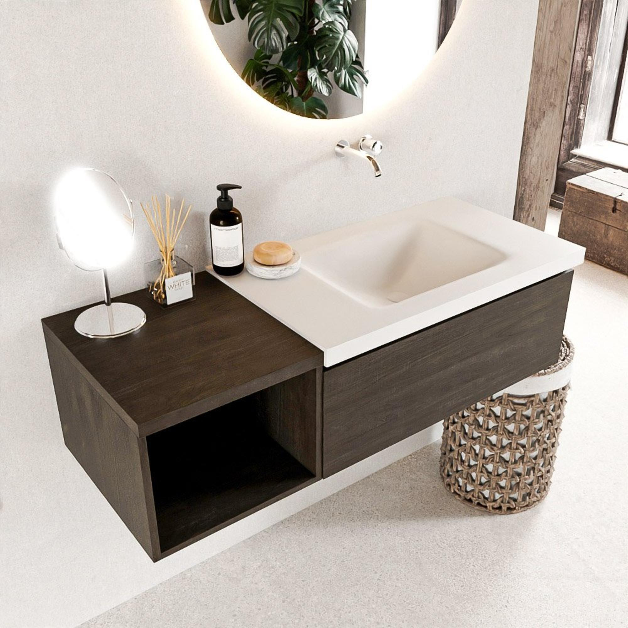 Het badmeubel is stijlvol en modern, met een strakke afwerking en een tijdloos ontwerp. De kleur Dark Brown geeft een warme en uitnodigende sfeer aan de badkamer. De combinatie van de lade en de open module zorgt voor een perfecte balans tussen functionaliteit en esthetiek.
