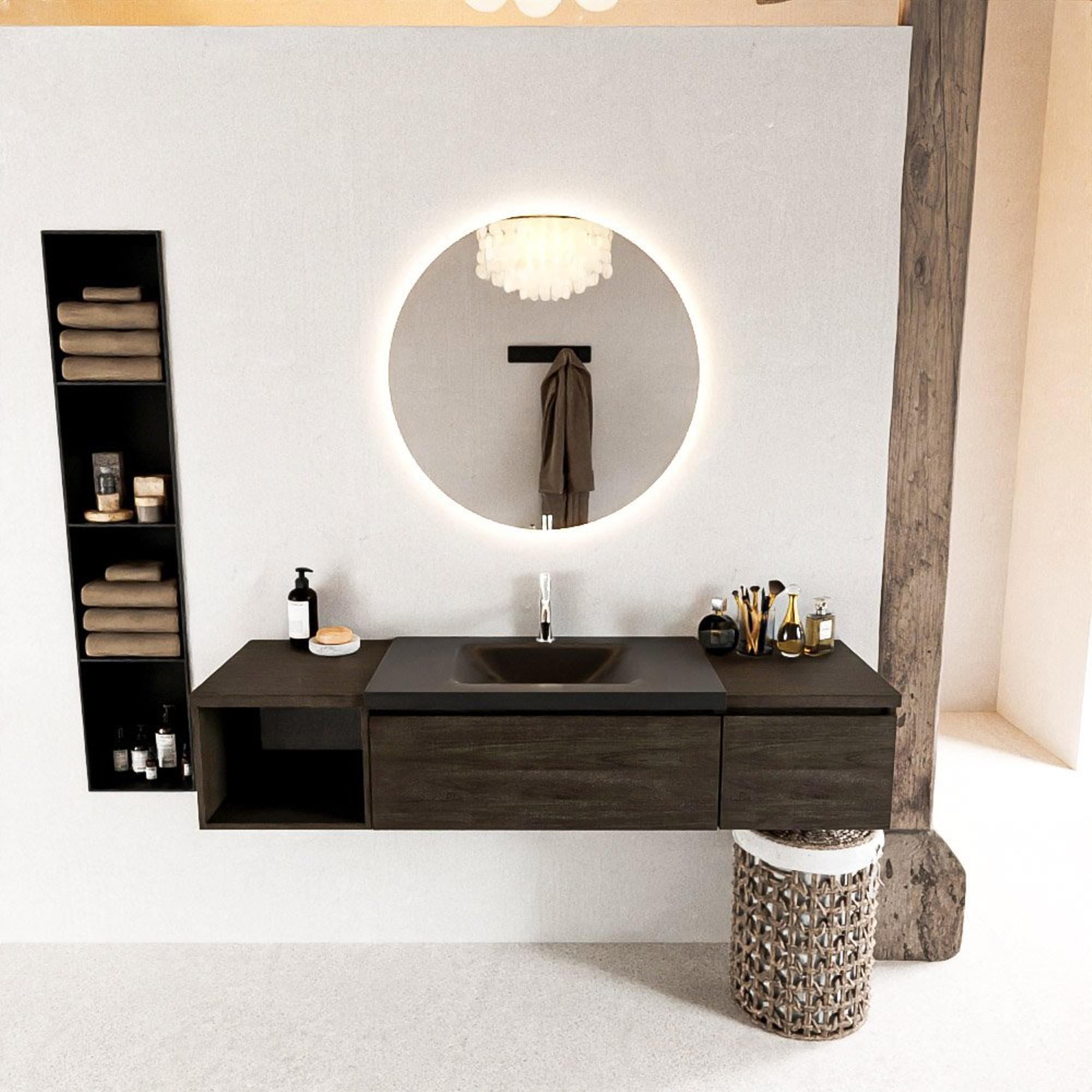 Dit badmeubel straalt pure elegantie uit dankzij de Dark Brown kleur en de strakke lijnen van het ontwerp. De open module aan de linkerkant geeft een ruimtelijk gevoel en biedt een stijlvolle manier om badkamerspullen op te bergen.