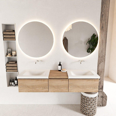 Ervaar de ultieme luxe met dit badmeubel en wastafelcombinatie. De Washed Oak kleur geeft een warme en uitnodigende uitstraling aan jouw badkamer. De 3 lades bieden voldoende opbergruimte voor al jouw badkamerbenodigdheden, terwijl de dubbele wastafel zorgt voor extra gemak en comfort tijdens jouw ochtendroutine.