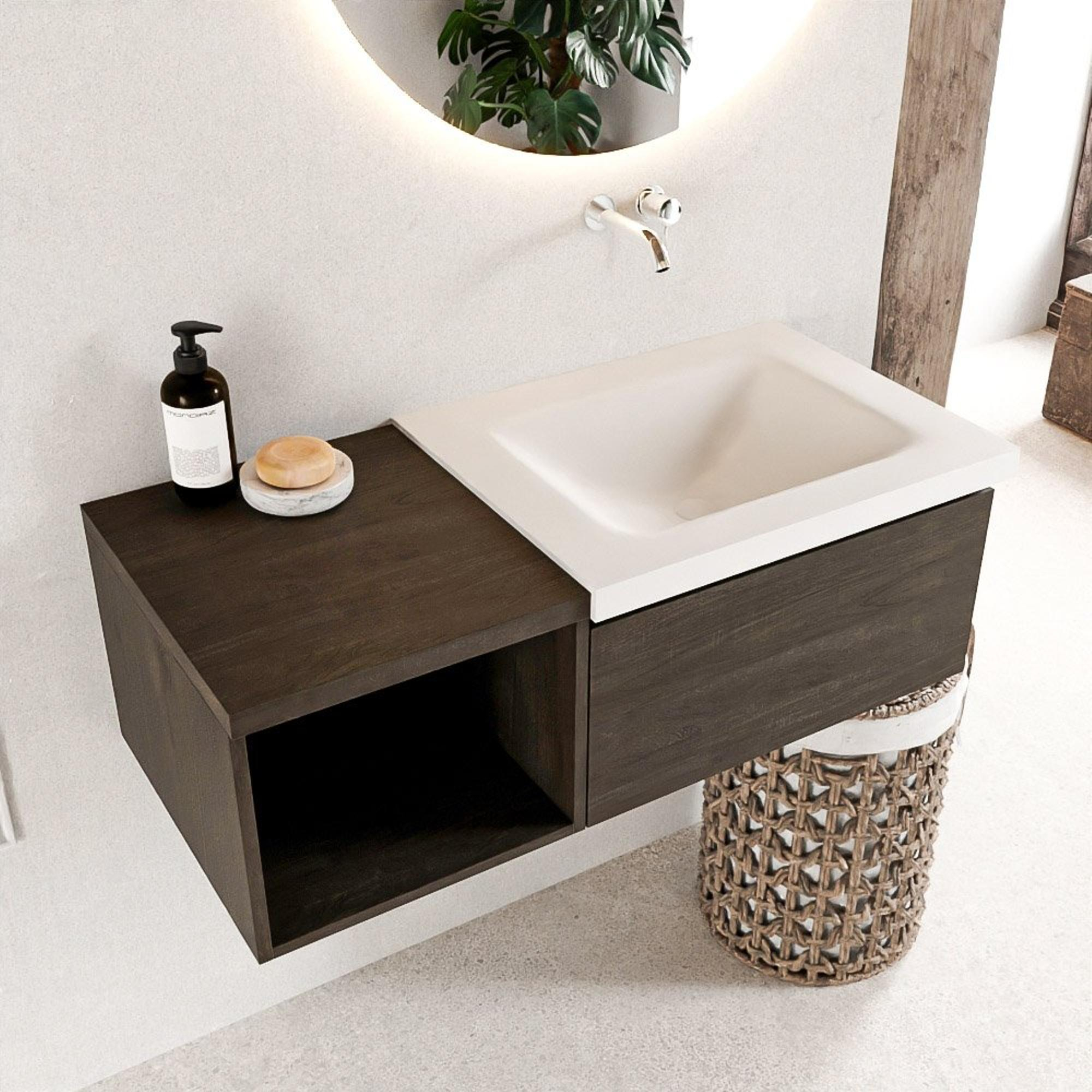 Dit badmeubel ademt luxe uit met zijn hoogwaardige afwerking en oog voor detail. De Dark Brown kleur geeft een warme en uitnodigende uitstraling aan je badkamer, terwijl de open module een eigentijdse touch toevoegt. De wastafel CLOUD in Talc kleur met 0 kraangaten is een subtiel pronkstuk dat functionaliteit combineert met elegantie.