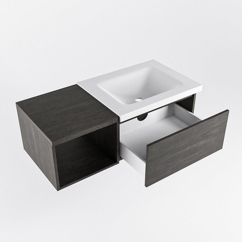 In een oogwenk zal dit badmeubel met open module je badkamer transformeren tot een oase van stijl en functionaliteit. Met een lengte van 100 cm en een elegante Dark Brown kleur, straalt dit meubel klasse en verfijning uit. De bijgevoegde wastafel CLOUD aan de rechterkant voegt een vleugje moderniteit toe, terwijl de 1 lade voldoende opbergruimte biedt voor al je badkamerbenodigdheden.