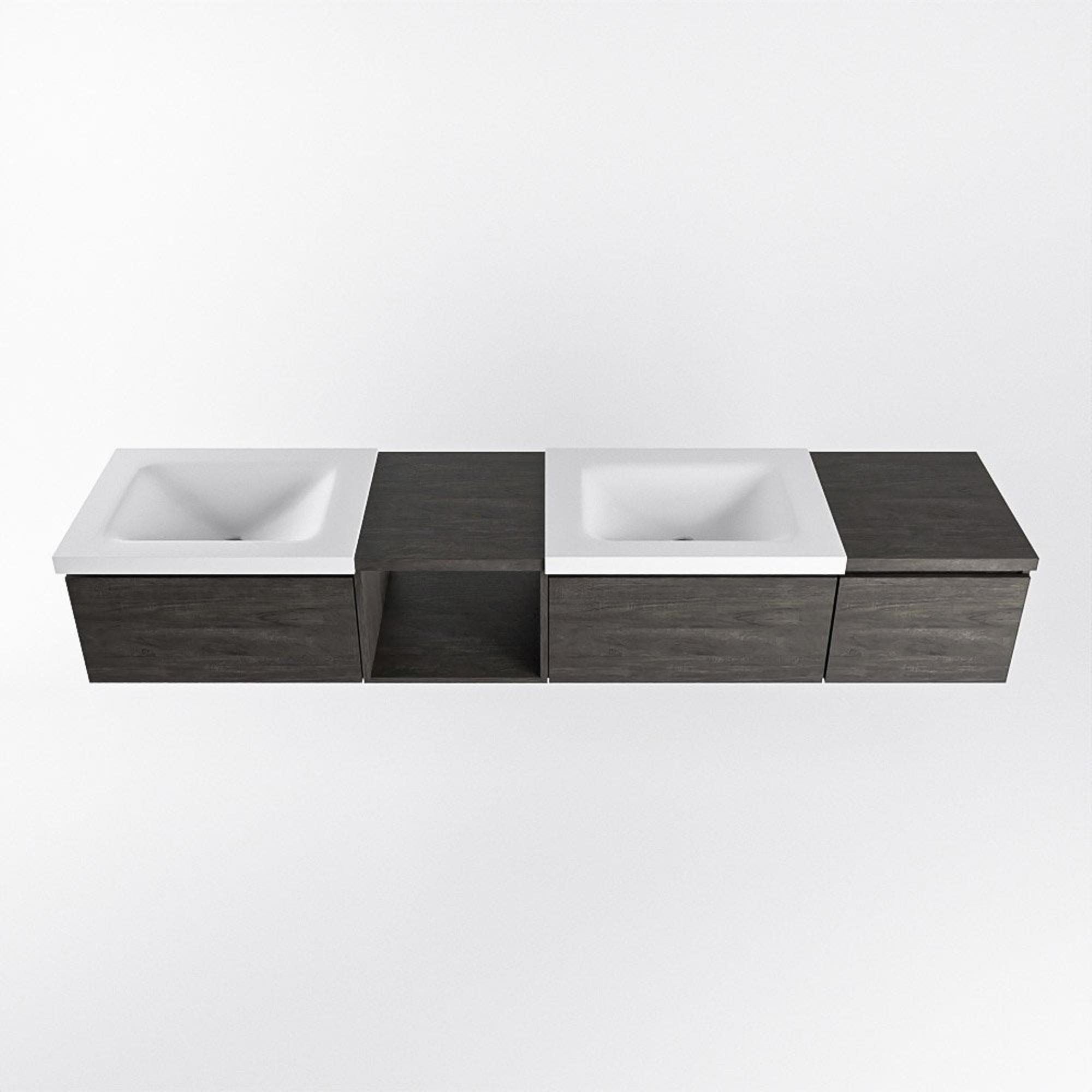 Met zijn strakke lijnen, donkerbruine kleur en open module aan de linkerkant straalt dit badmeubel een moderne en stijlvolle uitstraling uit. De drie lades bieden voldoende opbergruimte voor al jouw badkamerbenodigdheden, terwijl de dubbele wastafel een luxe touch toevoegt aan de ruimte.