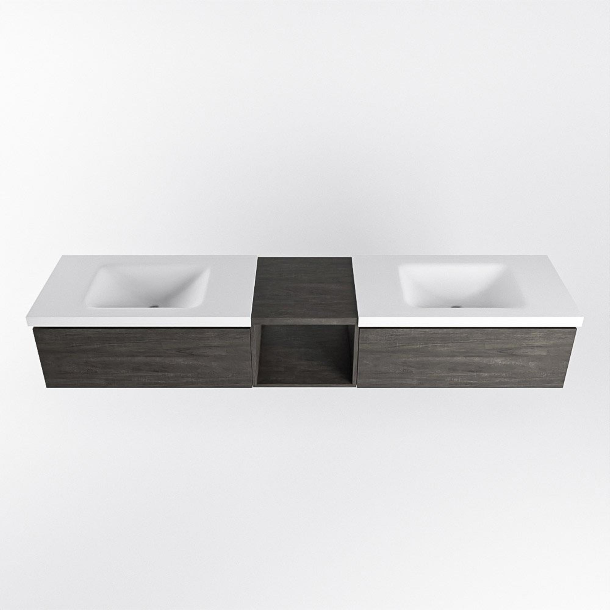 Met zijn donkerbruine kleur en strakke lijnen straalt dit badmeubel een tijdloze elegantie uit. De open module zorgt voor een ruimtelijk gevoel en biedt voldoende opbergruimte voor al jouw badkamerspullen. De dubbele wastafel in de kleur Talc voegt een vleugje frisheid toe aan het geheel, terwijl de 2 lades zorgen voor extra functionaliteit.