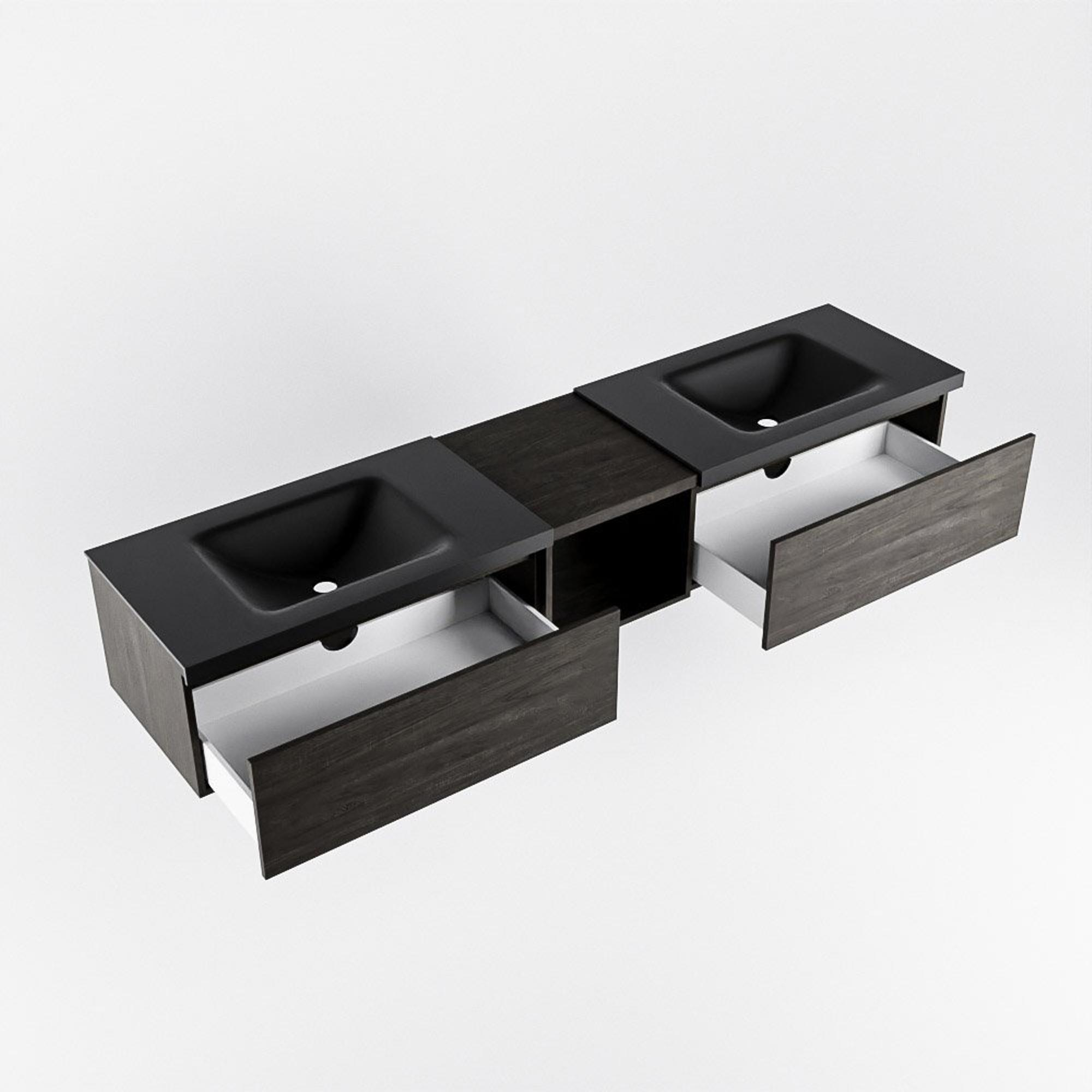 MONDIAZ BUKLA 200cm badmeubel met open module 40 kleur Dark Brown met 2 lades. Wastafel CLOUD dubbel 2 kraangaten kleur Urban.