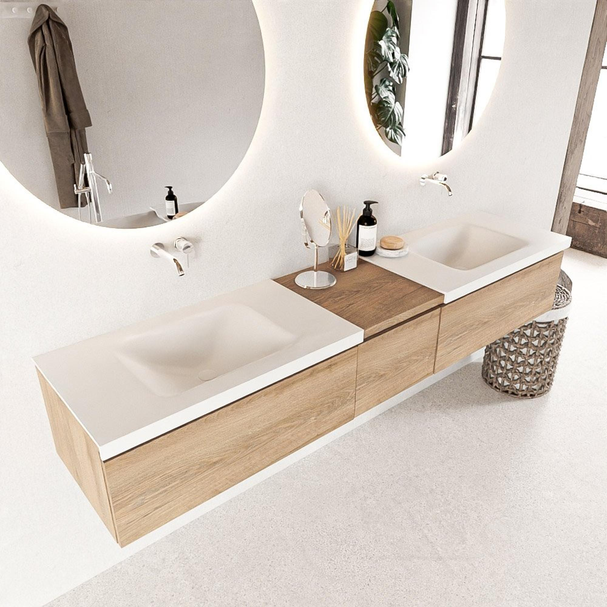 MONDIAZ BUKLA 200cm badmeubel met module 40 kleur Washed Oak met 3 lades. Wastafel CLOUD dubbel 0 kraangaten kleur Talc.
