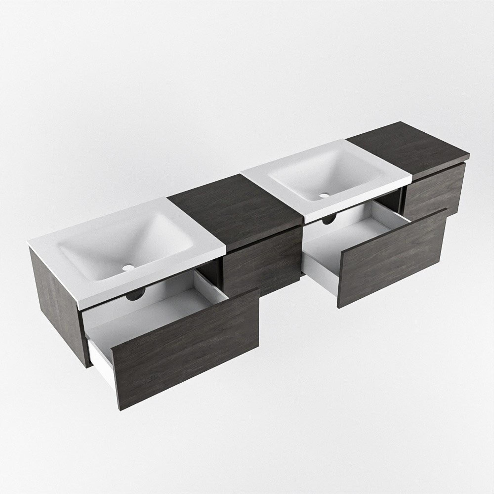 Naast zijn esthetische aantrekkingskracht is dit badmeubel ook uiterst functioneel. De geïntegreerde wastafel met dubbele wasbakken in een prachtige talc kleur voegt een vleugje luxe toe aan je dagelijkse routine. De 0 kraangaten zorgen voor een gestroomlijnde look, terwijl de hoogwaardige materialen zorgen voor duurzaamheid en langdurige prestaties.