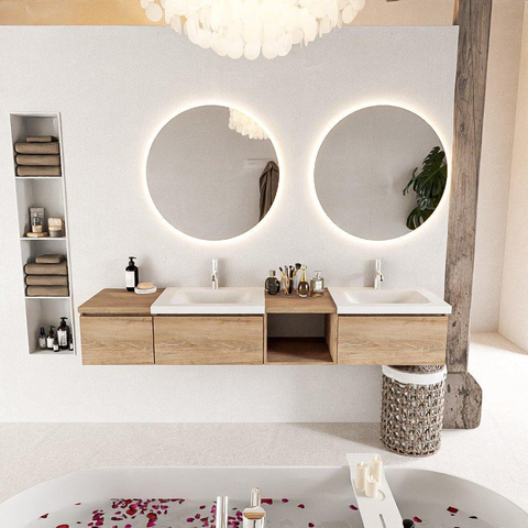 Dit badmeubel is ontworpen met oog voor stijl. De Washed Oak kleur geeft een warme en moderne uitstraling aan de badkamer. De open module aan de rechterkant zorgt voor een speels element en biedt ruimte voor het tentoonstellen van decoratieve items of het opbergen van handdoeken.