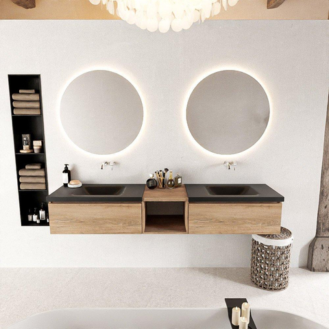 Dit badmeubel combineert stijl met functionaliteit, waardoor het niet alleen mooi is om naar te kijken, maar ook handig in gebruik. De open module en 2 lades bieden voldoende opbergruimte voor al jouw badkamerspullen, terwijl de dubbele wastafel zorgt voor extra gemak tijdens drukke ochtenden. Maak jouw badkamer compleet met dit praktische en elegante meubel.