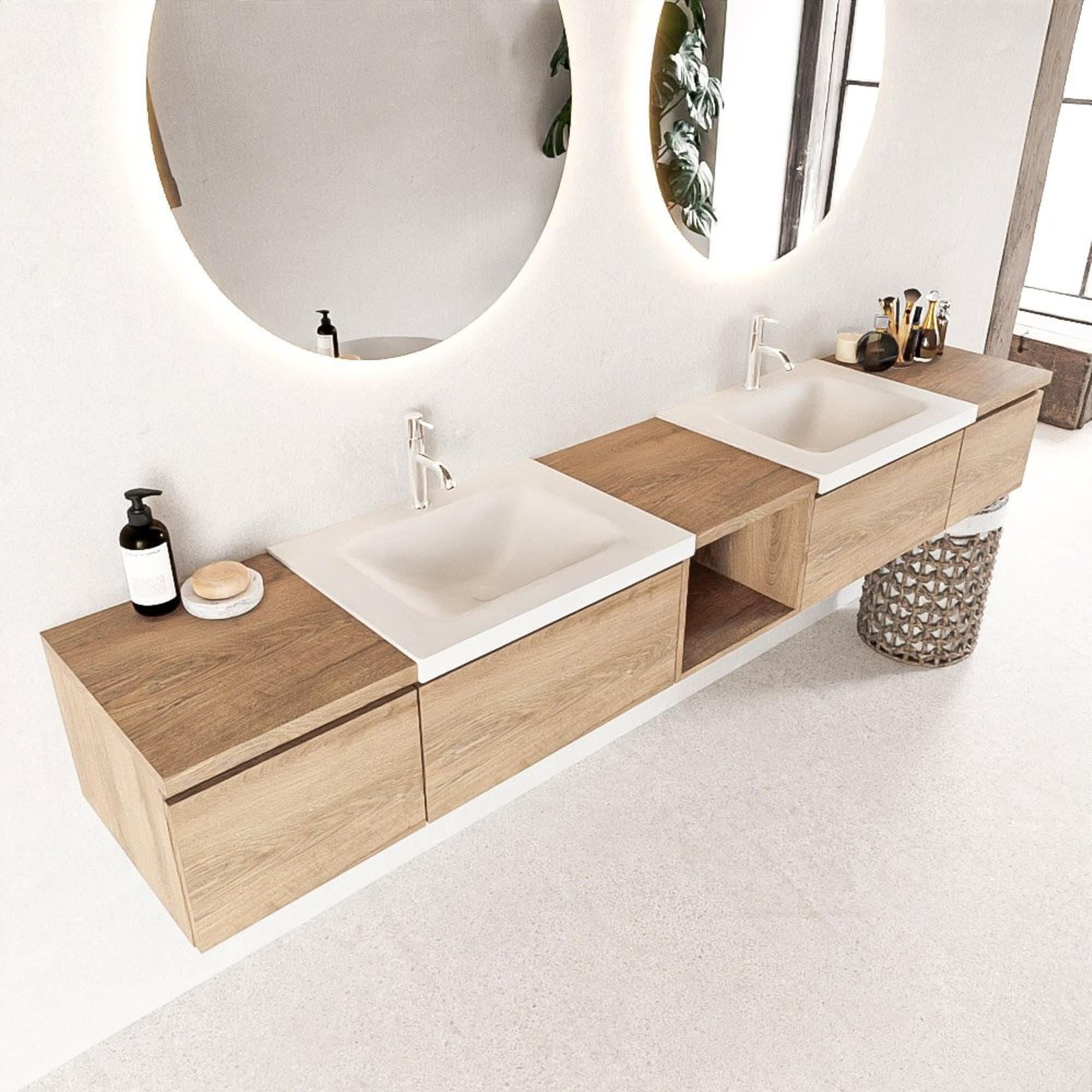 MONDIAZ BUKLA 240cm badmeubel met open module 40 midden kleur Washed Oak met 4 lades. Wastafel CLOUD dubbel 2 kraangaten kleur Talc.