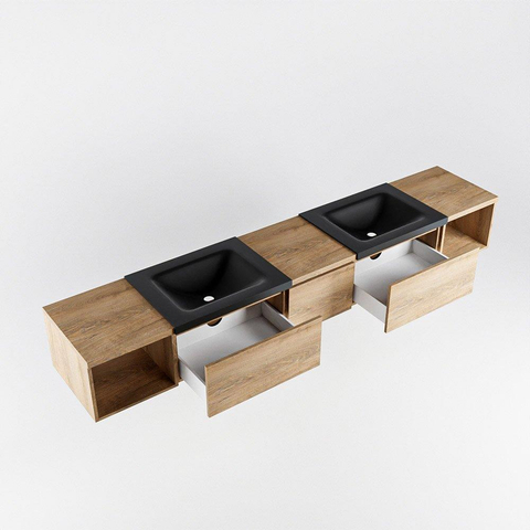 MONDIAZ BUKLA 240cm badmeubel met open module 40 L+R kleur Washed Oak met 3 lades. Wastafel CLOUD dubbel 0 kraangaten kleur Urban.
