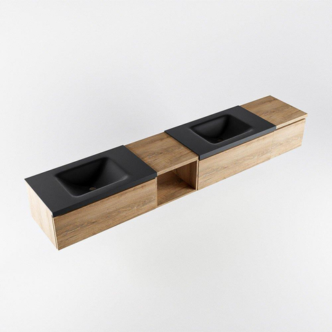 MONDIAZ BUKLA 240cm badmeubel met open module 40 links kleur Washed Oak met 3 lades. Wastafel CLOUD dubbel 0 kraangaten kleur Urban.
