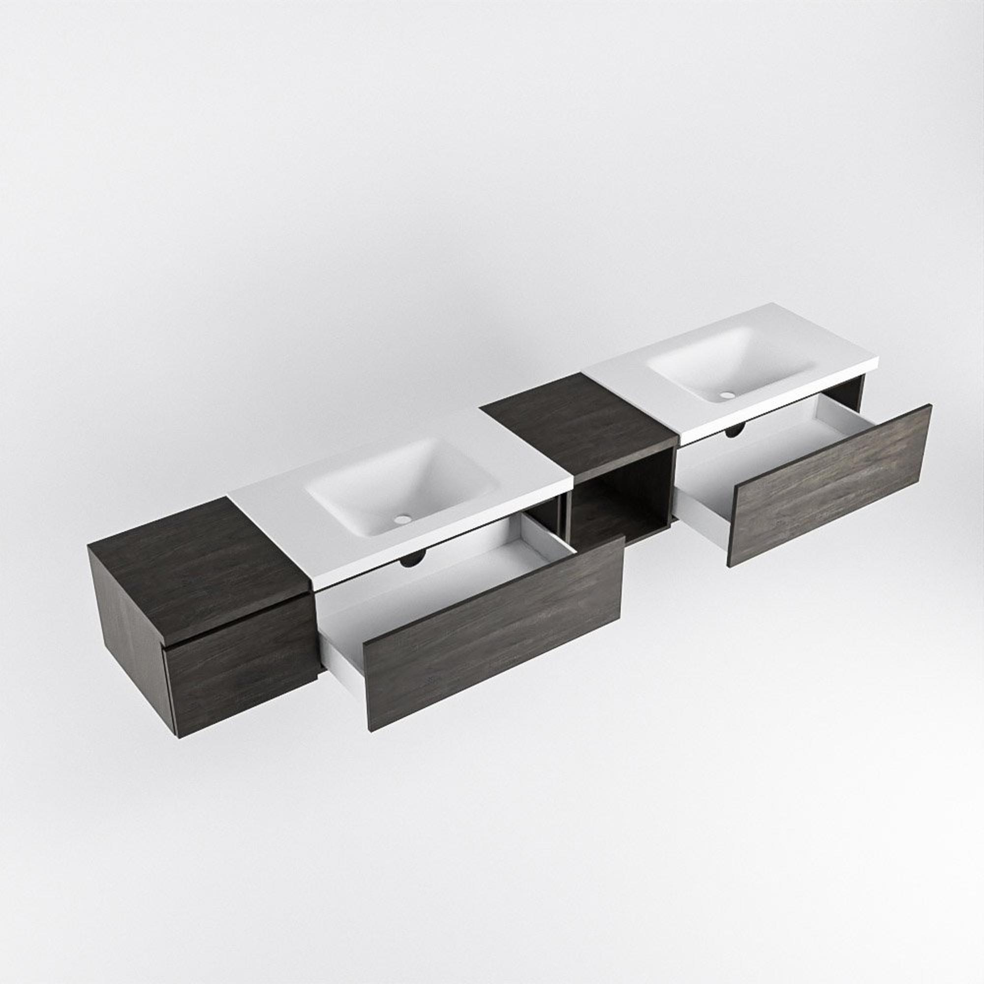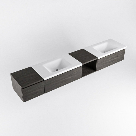 Dit badmeubel straalt pure luxe uit dankzij zijn donkerbruine kleur en moderne ontwerp. De open module aan de rechterkant zorgt voor een ruimtelijk gevoel en biedt voldoende opbergruimte voor al je badkamerspullen. De drie lades zijn handig voor het opbergen van kleine items, terwijl de dubbele wastafel met elegante kraangaten een vleugje elegantie toevoegt aan de ruimte.