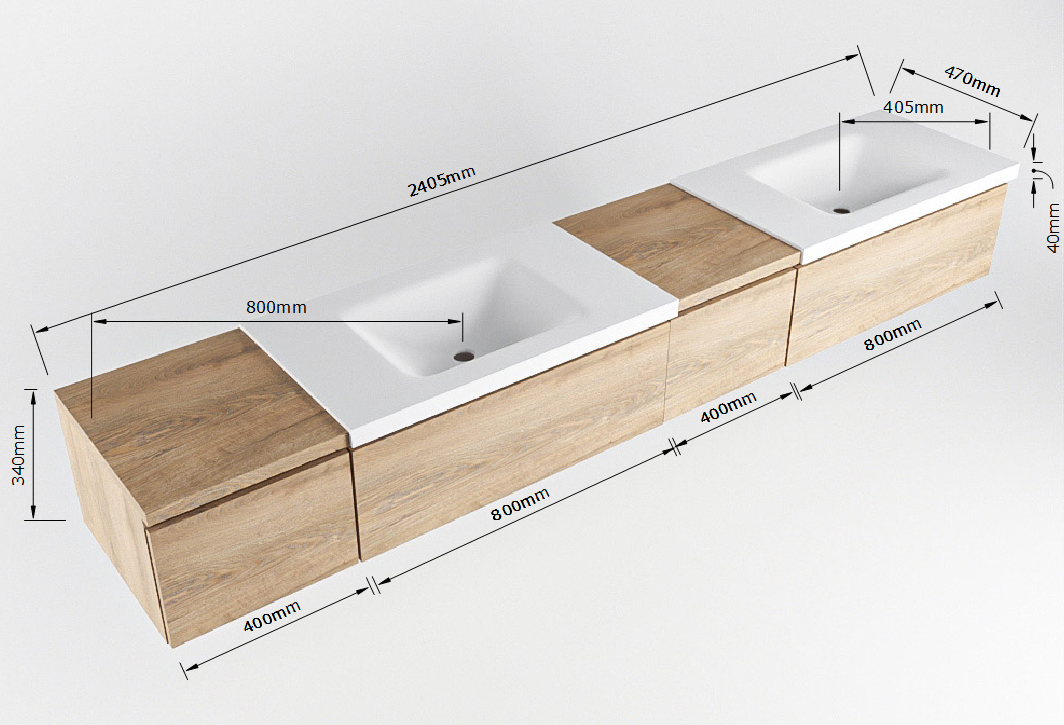 Met de 240cm breedte en de rechts geplaatste module biedt dit badmeubel een slimme indeling die optimaal gebruik maakt van de beschikbare ruimte. De dubbele wastafel met Cloud design en geen kraangaten zorgt voor een strakke en moderne uitstraling. De lades zijn voorzien van soepele geleiders voor gemakkelijke toegang tot je spullen.