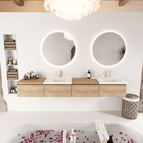 Met zijn prachtige Washed Oak kleur en dubbele wastafel in Talc, straalt dit badmeubel pure luxe uit. De 4 lades bieden voldoende opbergruimte voor al jouw badkamerspullen, terwijl de module aan de linkerkant zorgt voor een handige indeling. Het geheel ademt een sfeer van elegantie en comfort, waardoor je badkamer een ware spa-ervaring wordt.