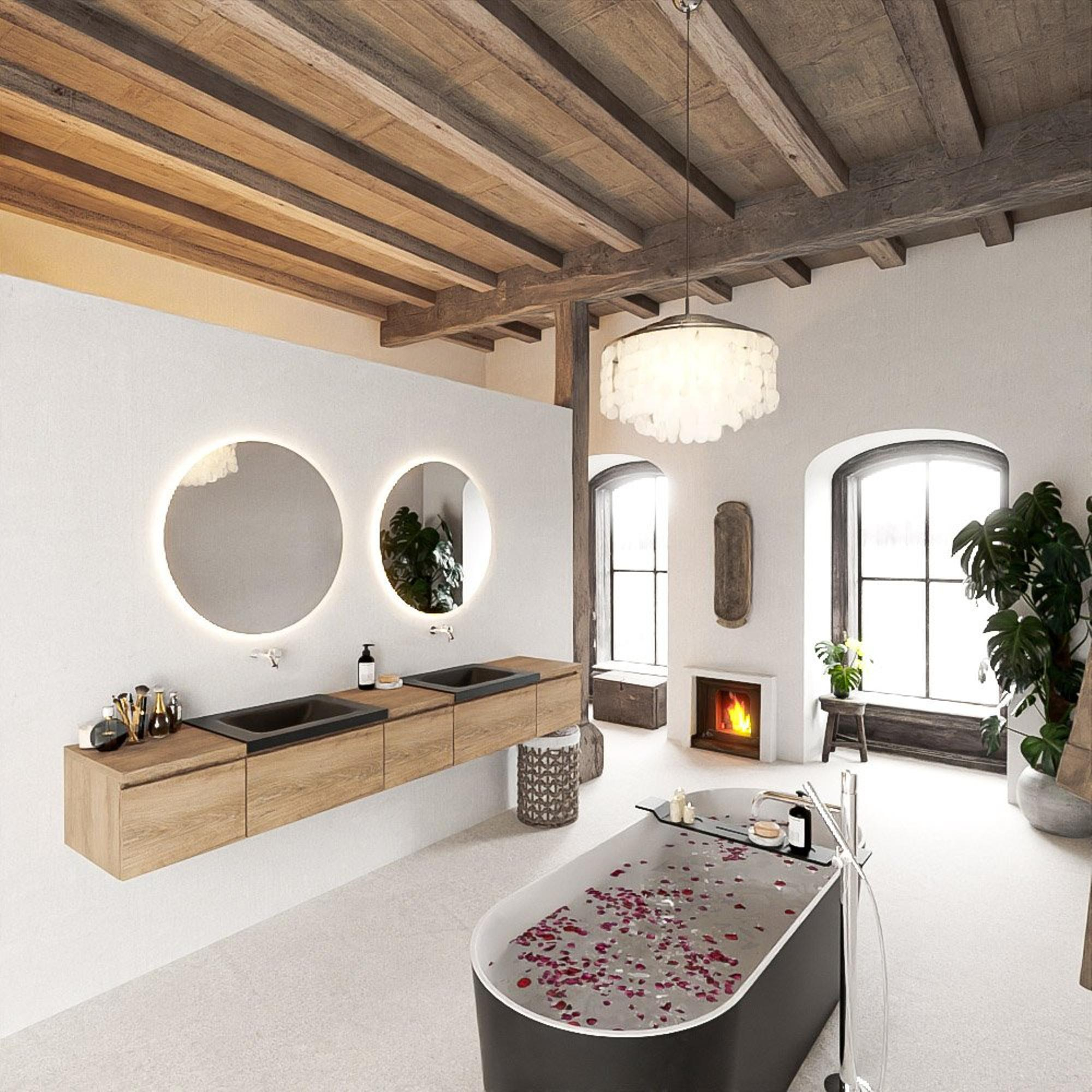 MONDIAZ BUKLA 240cm badmeubel met module 40 kleur Washed Oak met 5 lades. Wastafel CLOUD dubbel 0 kraangaten kleur Urban.