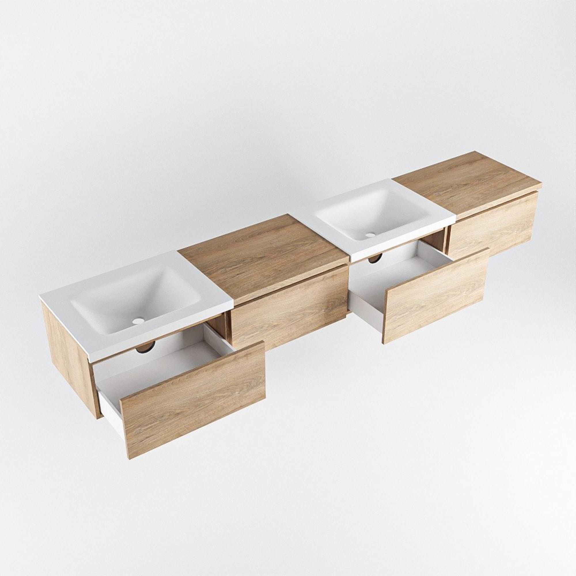 MONDIAZ BUKLA 240cm badmeubel met module 60 rechts kleur Washed Oak met 4 lades. Wastafel CLOUD dubbel 0 kraangaten kleur Talc.