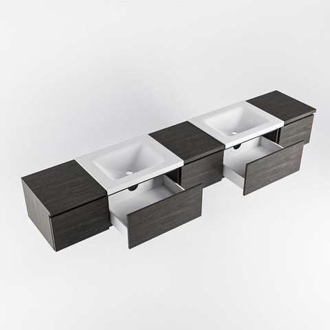 Met zijn donkerbruine kleur en strakke lijnen straalt dit badmeubel een tijdloze elegantie uit. De 5 lades bieden voldoende opbergruimte voor al jouw badkamerbenodigdheden, terwijl de dubbele wastafel zorgt voor ultiem gemak tijdens drukke ochtenden.