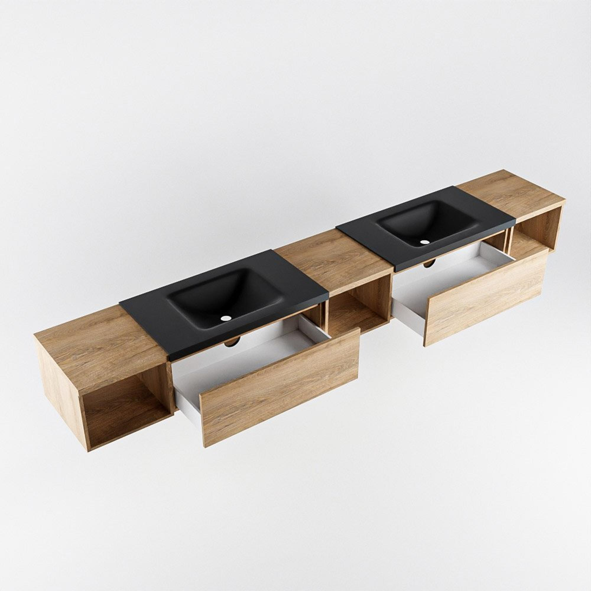 MONDIAZ BUKLA 280cm badmeubel met open module 40 L+M+R kleur Washed Oak met 2 lades. Wastafel CLOUD dubbel 0 kraangaten kleur Urban.
