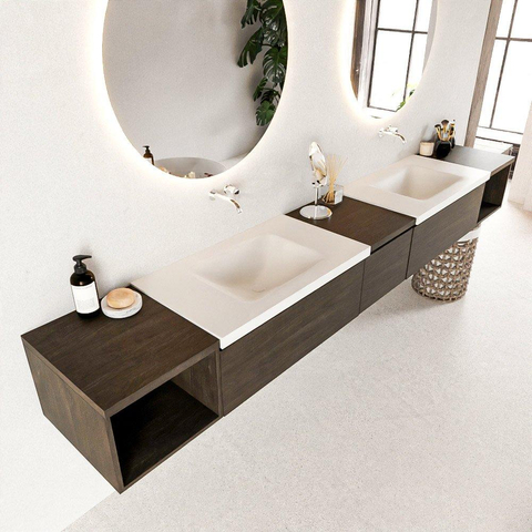 MONDIAZ BUKLA 280cm badmeubel met open module 40 L+R kleur Dark Brown met 3 lades. Wastafel CLOUD dubbel 0 kraangaten kleur Talc.