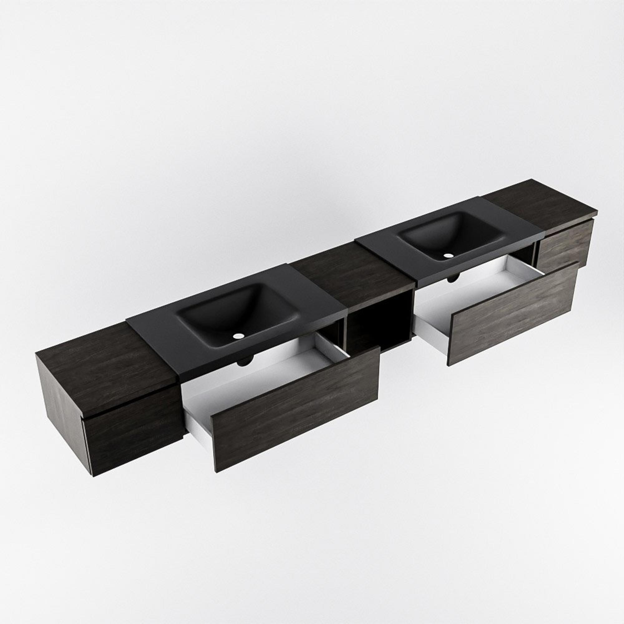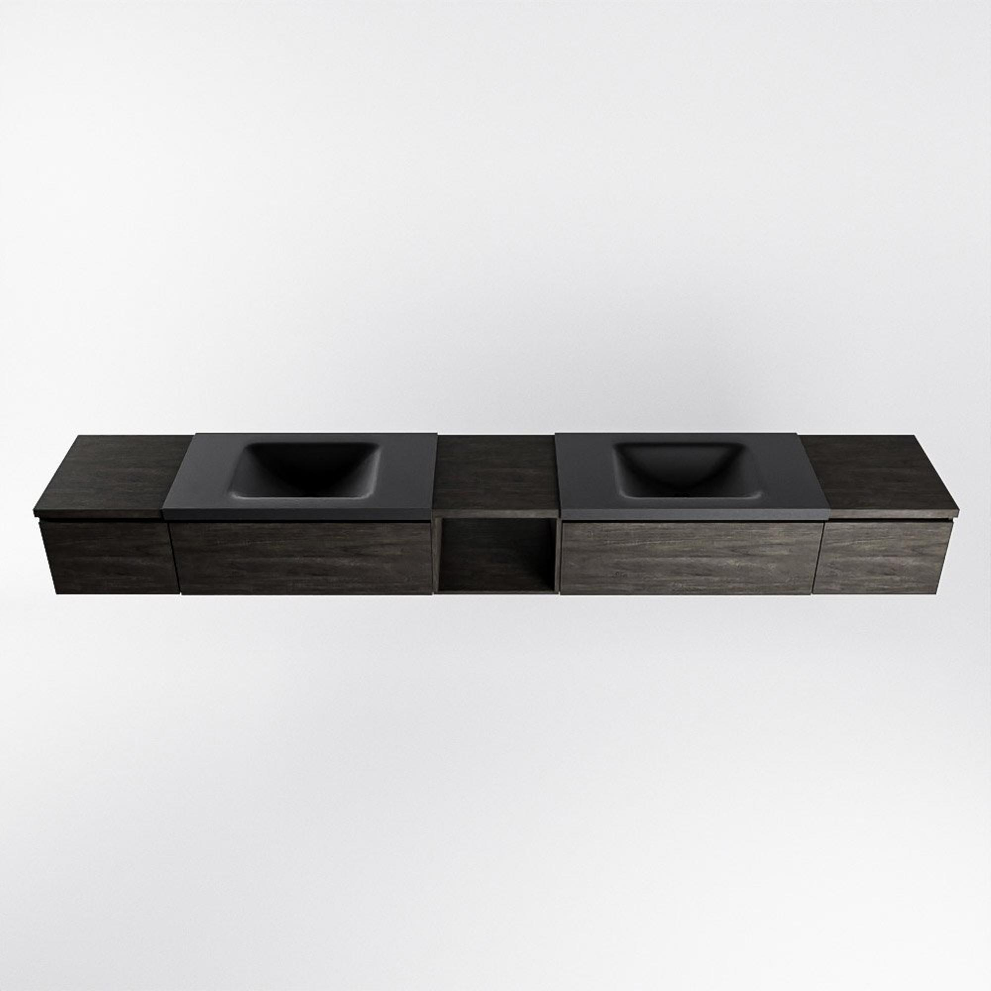 MONDIAZ BUKLA 280cm badmeubel met open module 40 midden kleur Dark Brown met 4 lades. Wastafel CLOUD dubbel 0 kraangaten kleur Urban.