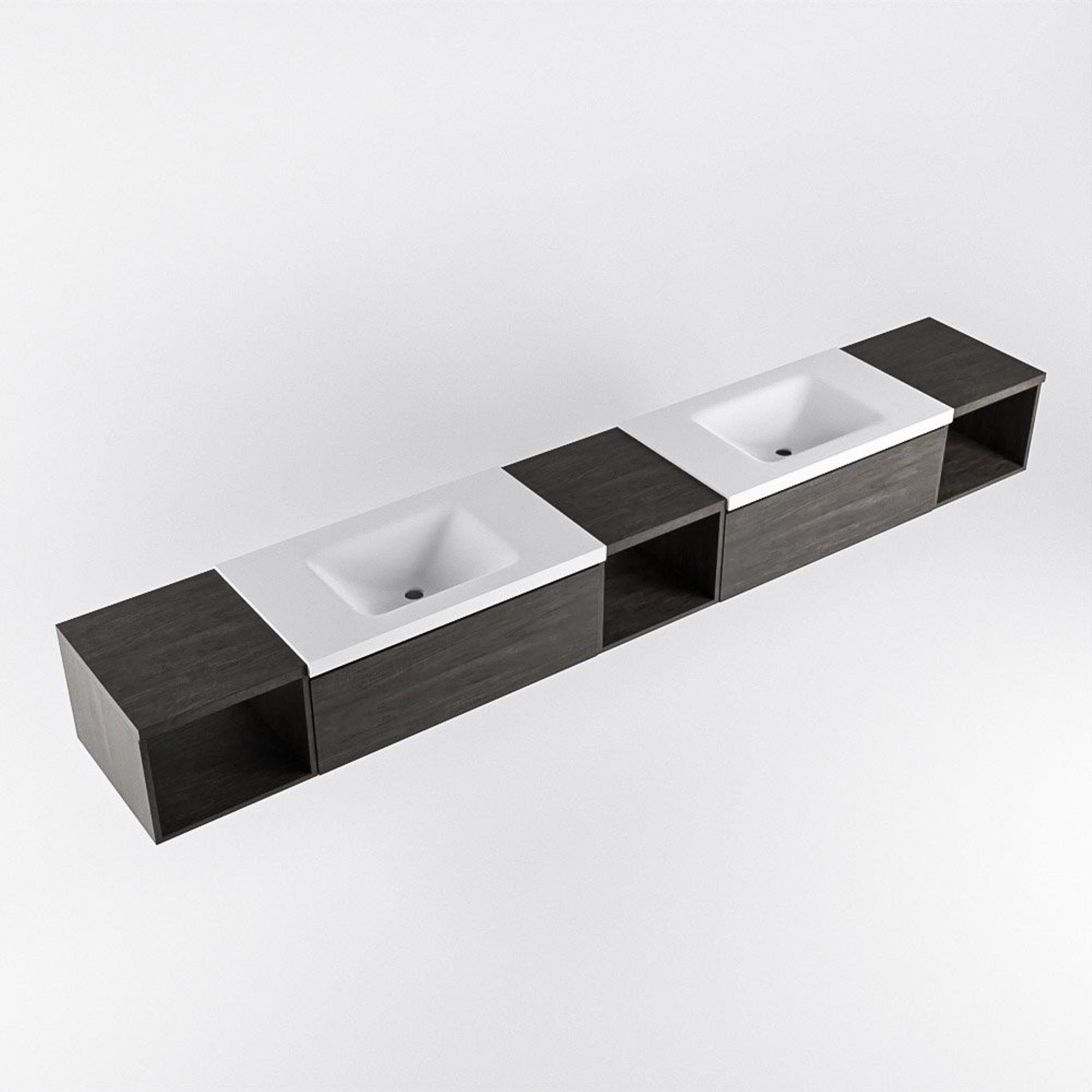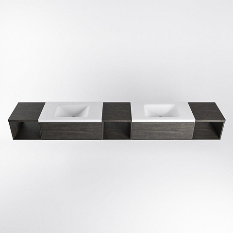 MONDIAZ BUKLA 280cm badmeubel met open module 40 L+M+R kleur Dark Brown met 2 lades. Wastafel CLOUD dubbel 2 kraangaten kleur Talc.