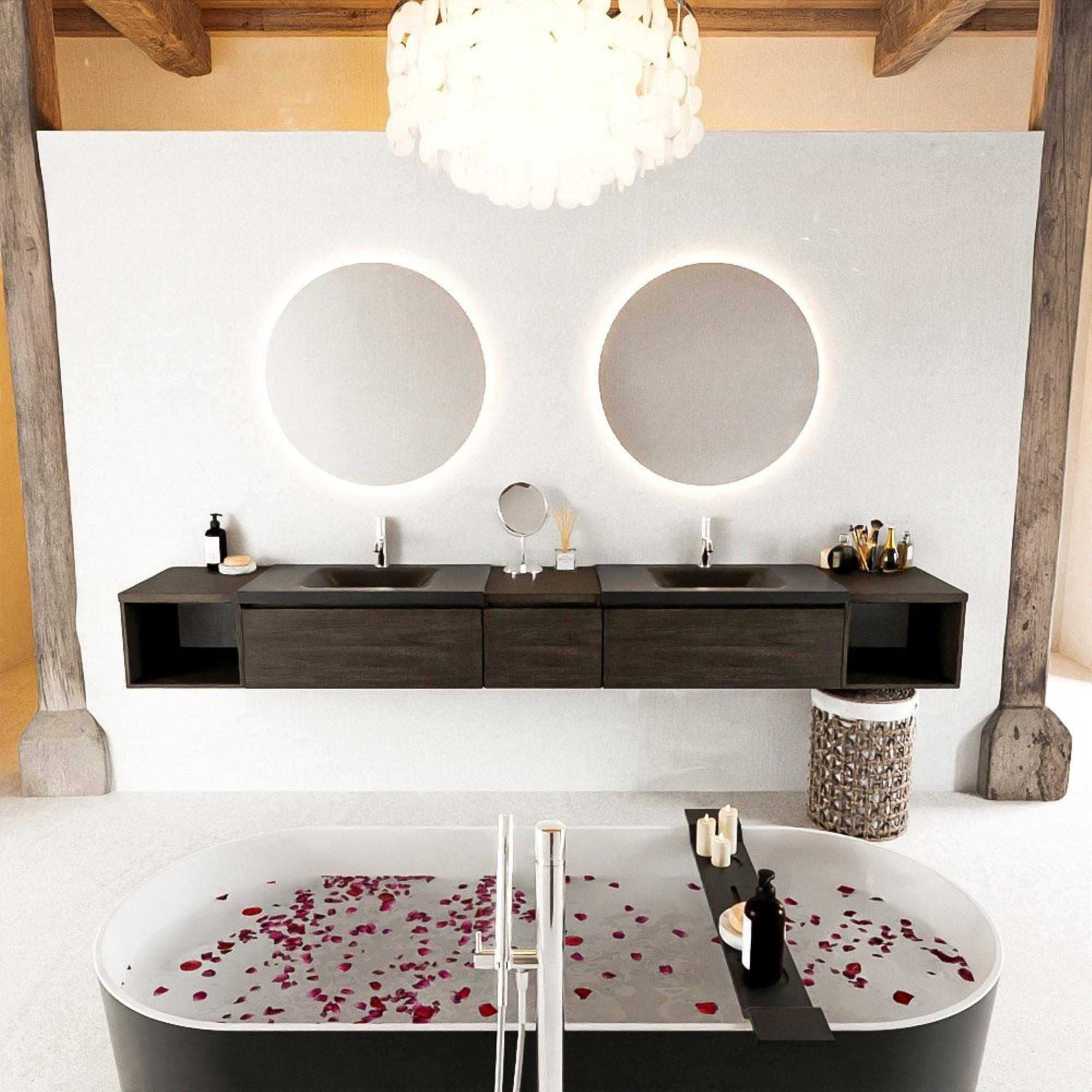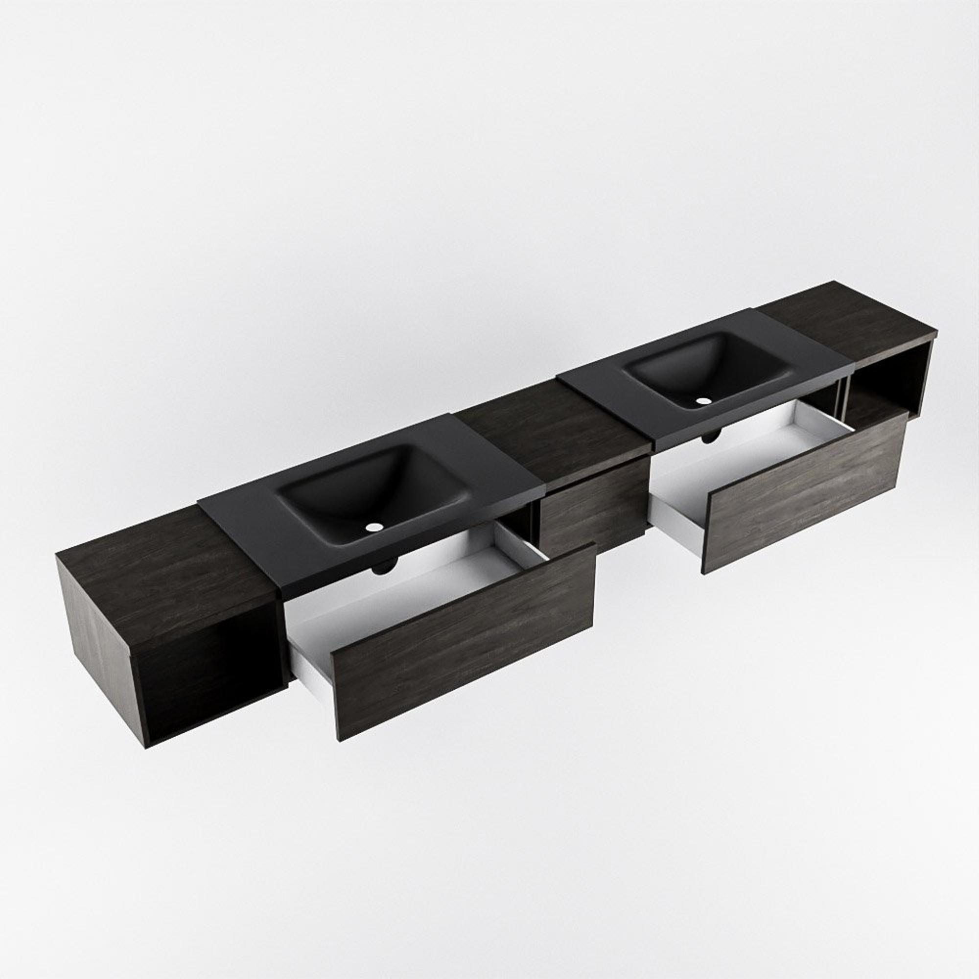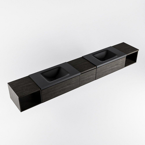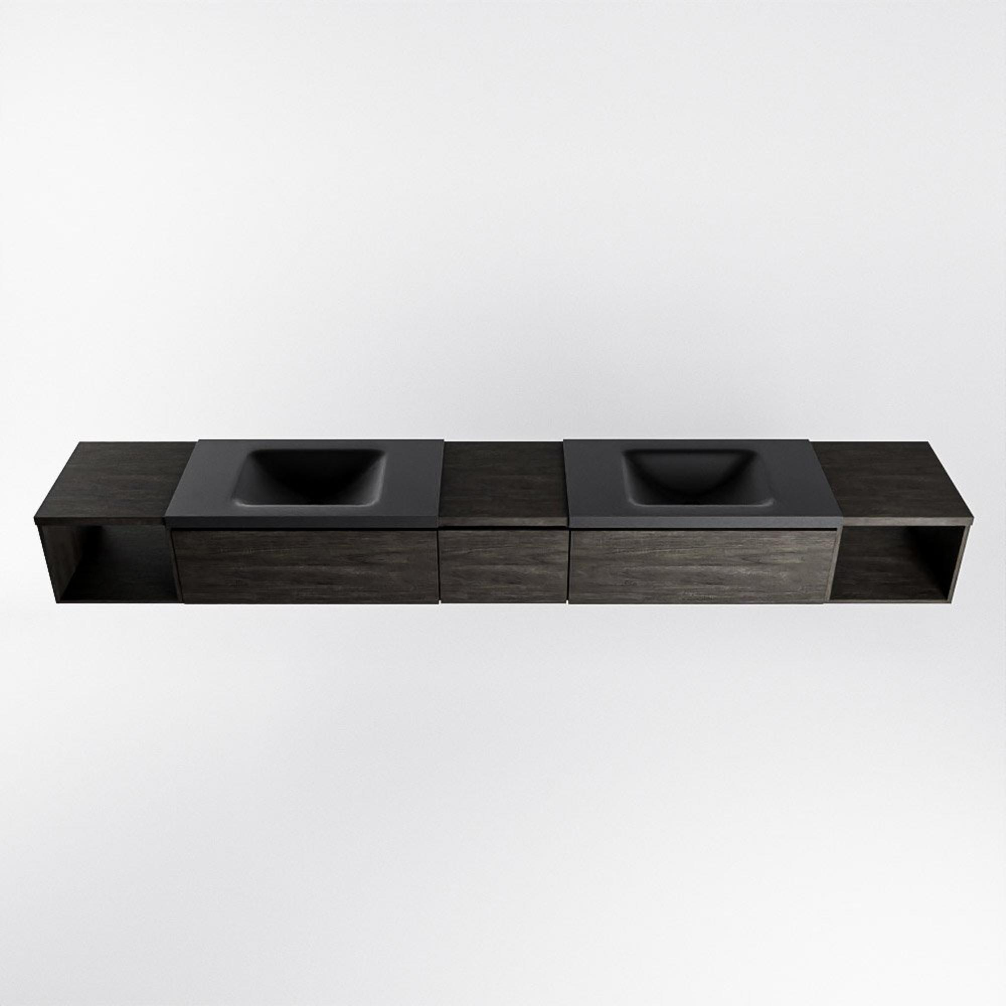 MONDIAZ BUKLA 280cm badmeubel met open module 40 L+R kleur Dark Brown met 3 lades. Wastafel CLOUD dubbel 2 kraangaten kleur Urban.