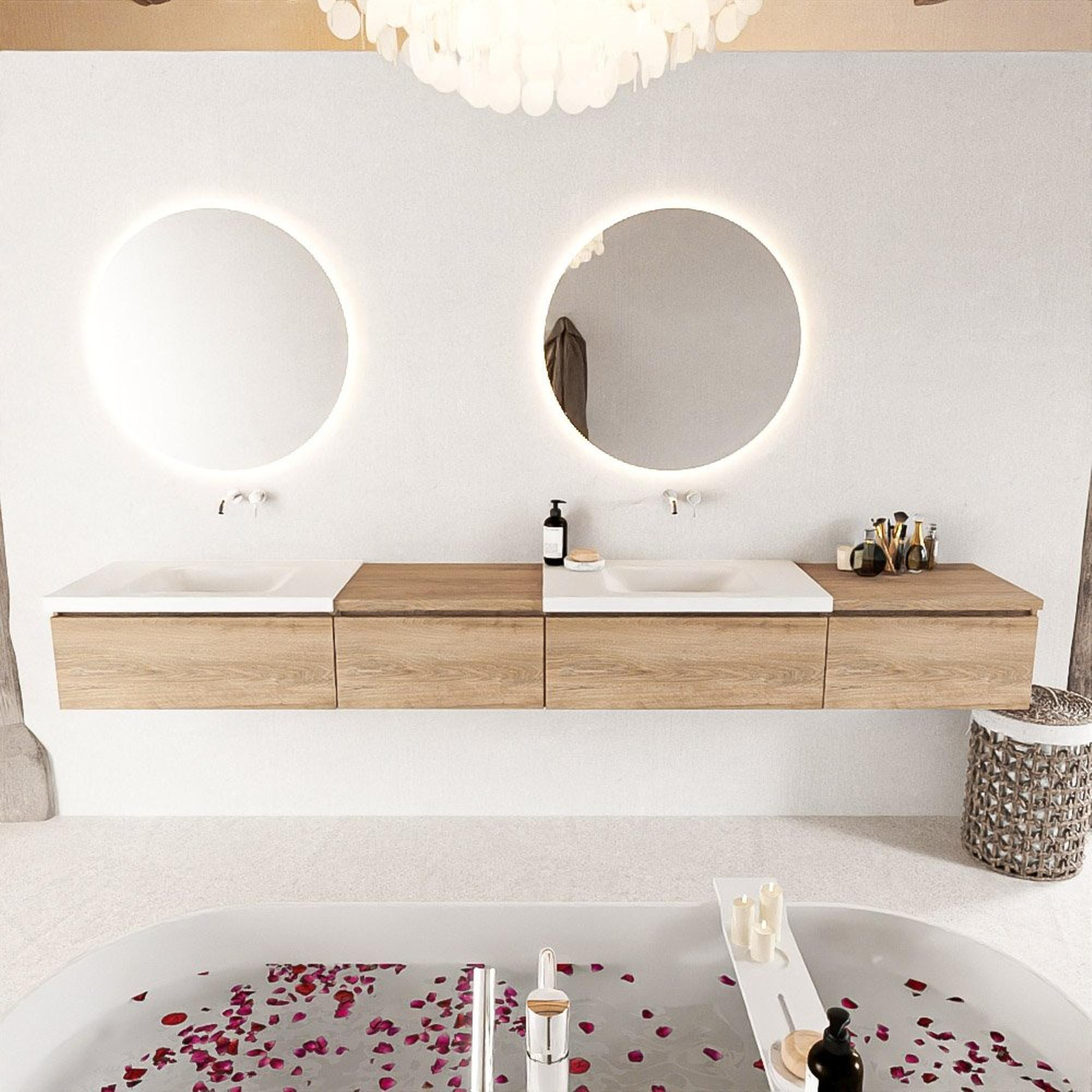 MONDIAZ BUKLA 280cm badmeubel met module 60 links kleur Washed Oak met 4 lades. Wastafel CLOUD dubbel 0 kraangaten kleur Talc.