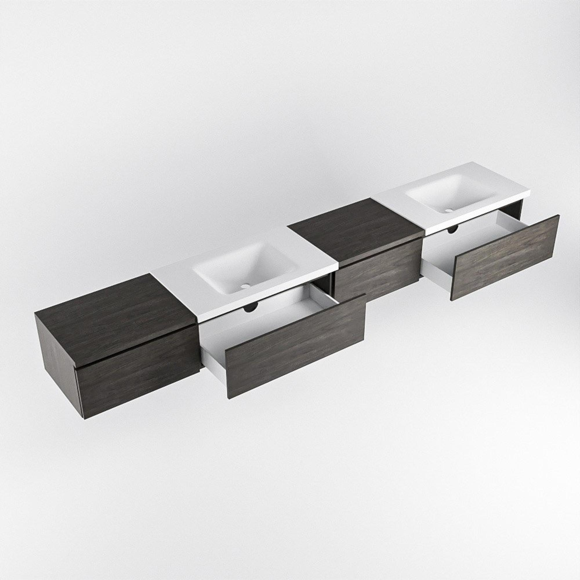 MONDIAZ BUKLA 280cm badmeubel met module 60 rechts kleur Dark Brown met 4 lades. Wastafel CLOUD dubbel 2 kraangaten kleur Talc.