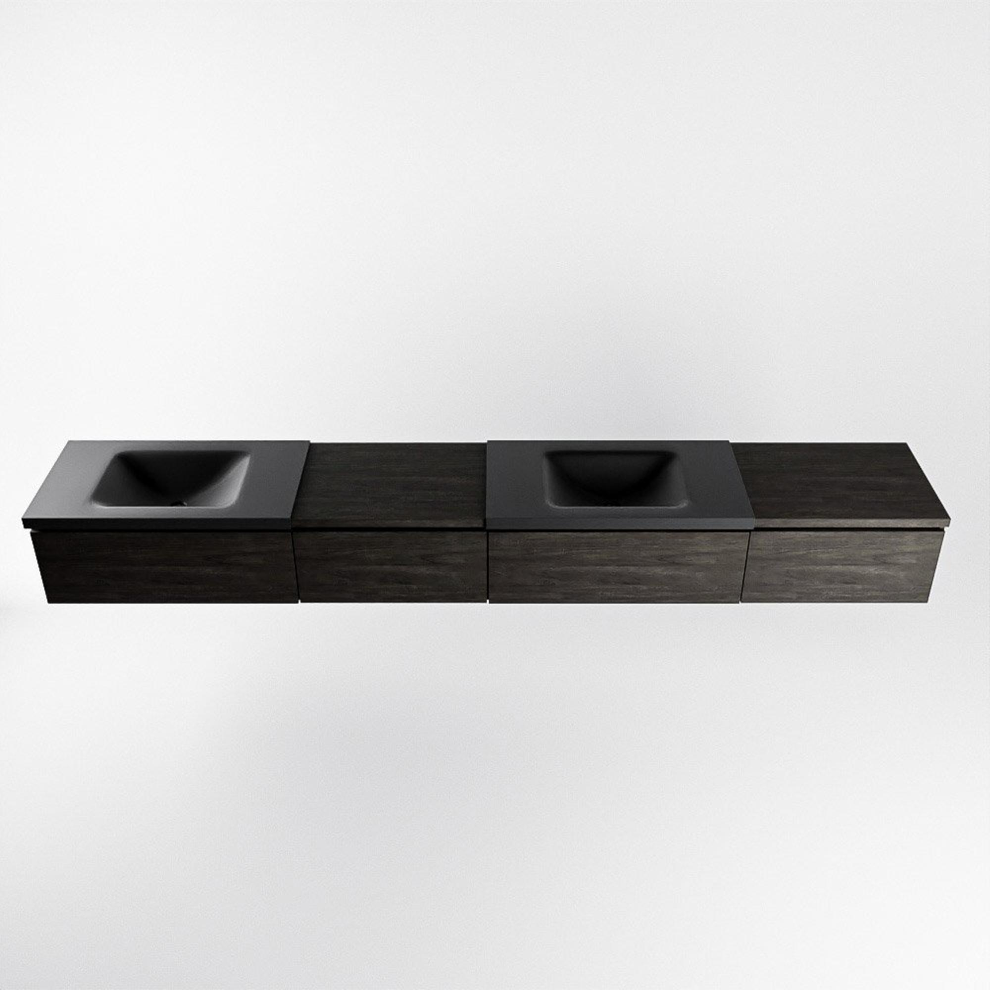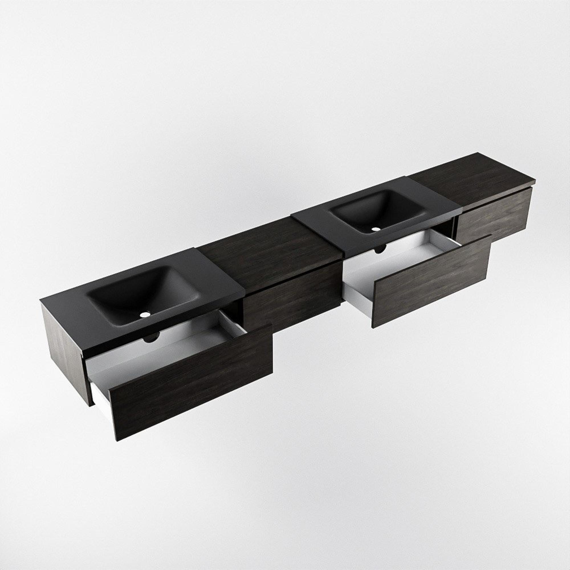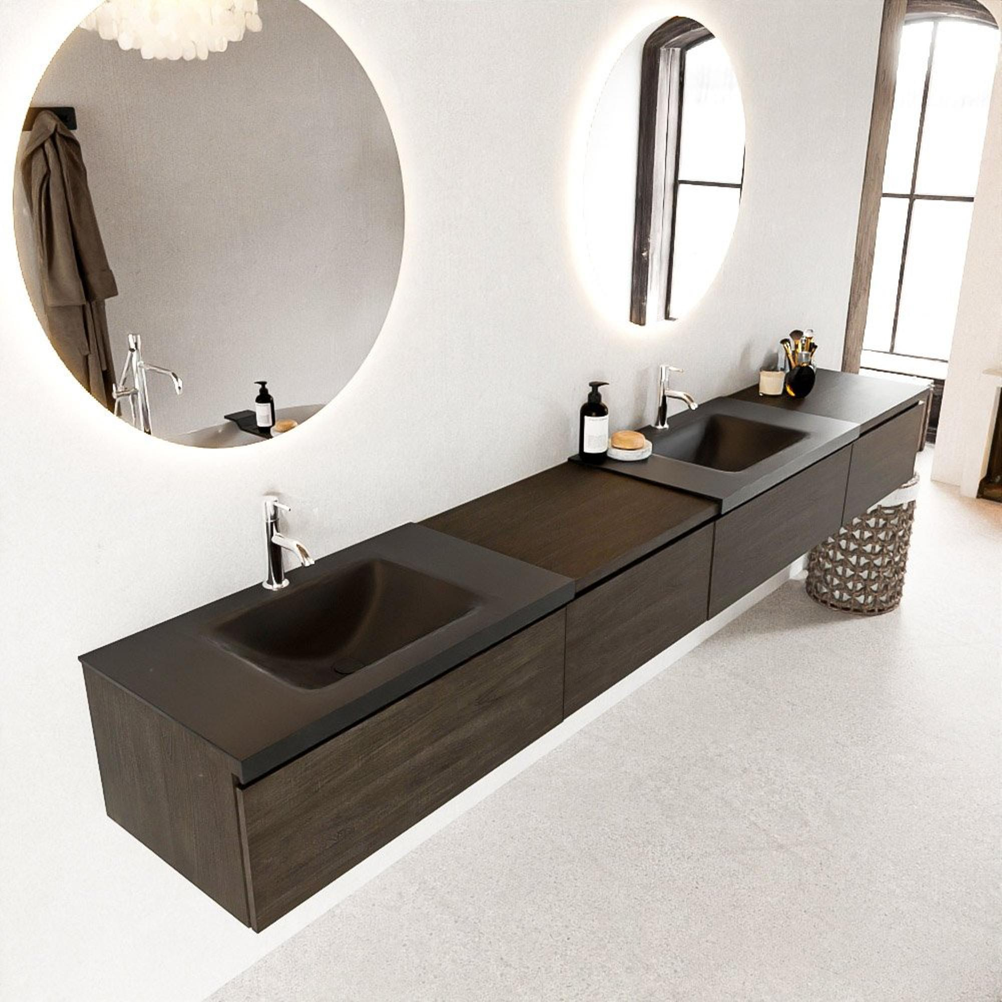 MONDIAZ BUKLA 280cm badmeubel met module 60 links kleur Dark Brown met 4 lades. Wastafel CLOUD dubbel 2 kraangaten kleur Urban.