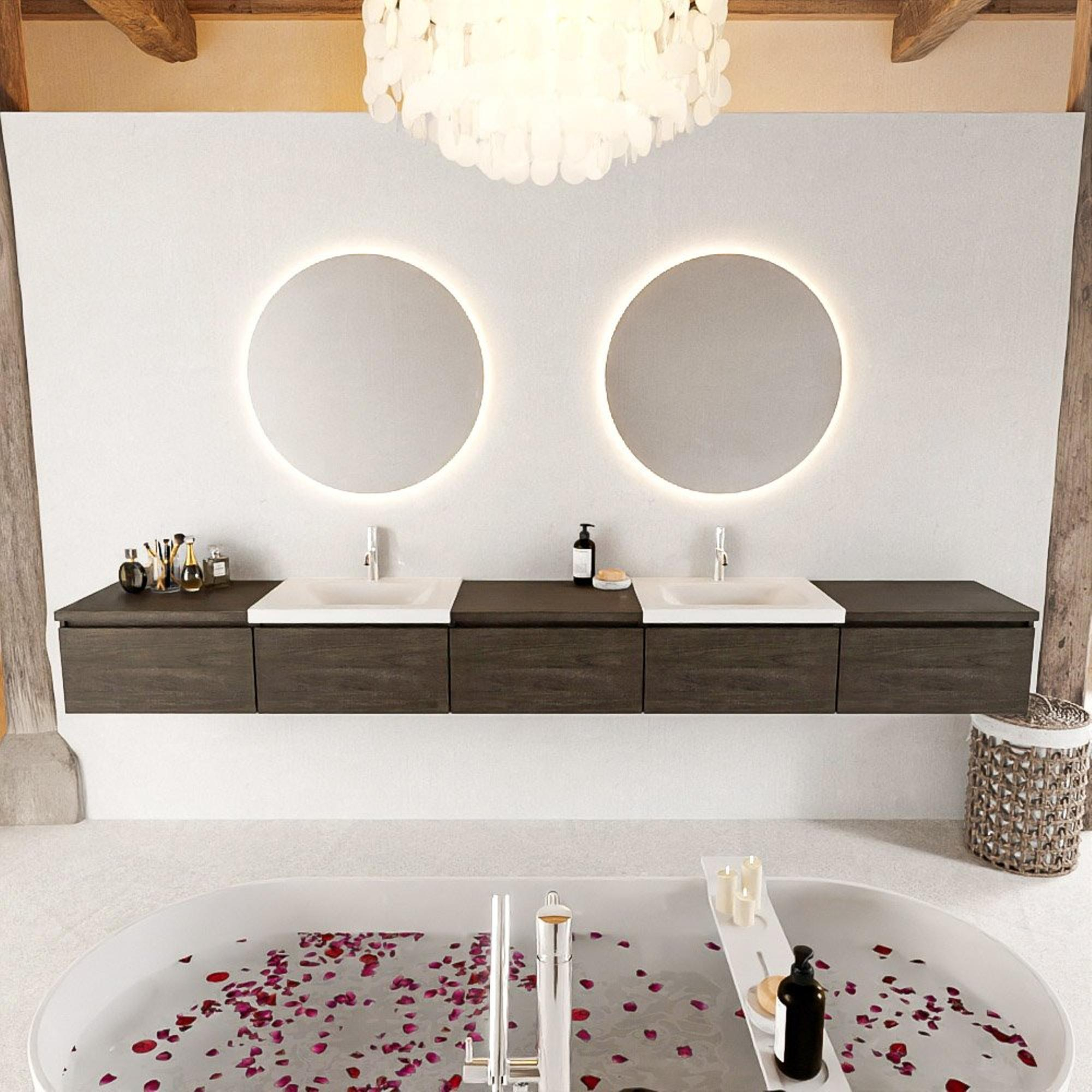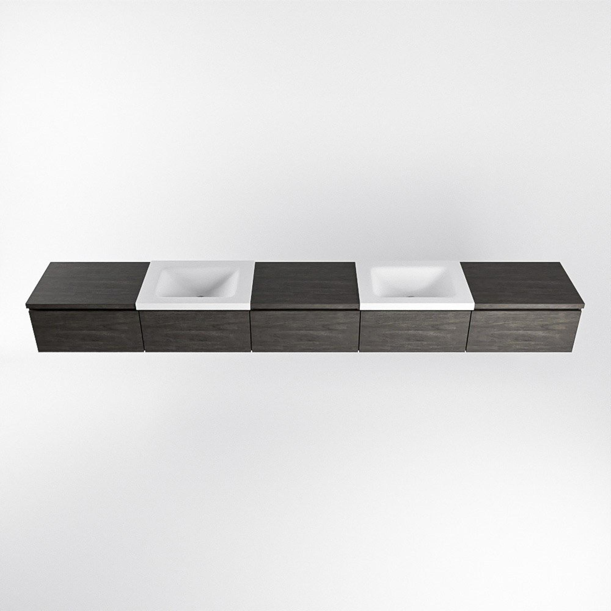 MONDIAZ BUKLA 300cm badmeubel met module 60 kleur Dark Brown met 5 lades. Wastafel CLOUD dubbel 2 kraangaten kleur Talc.