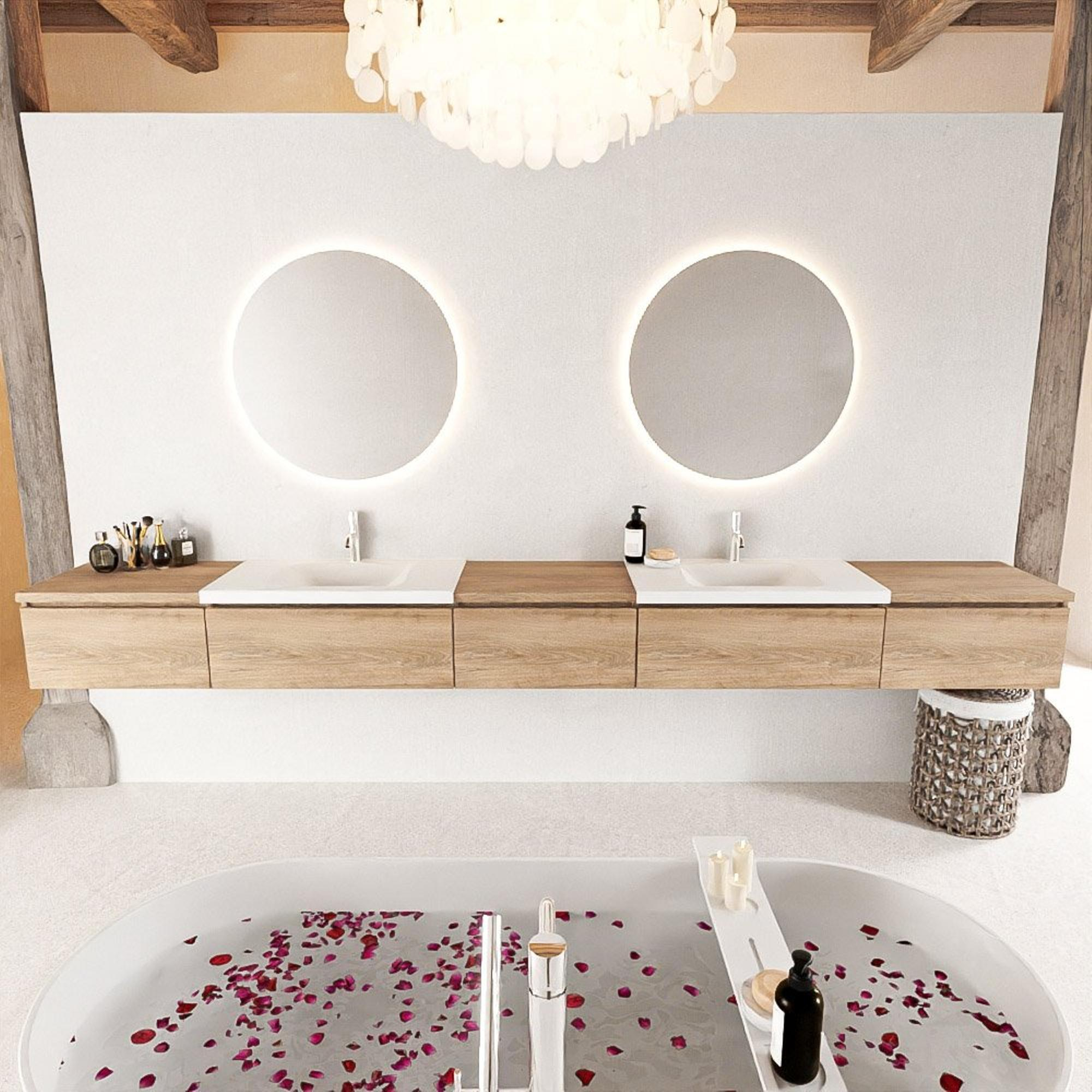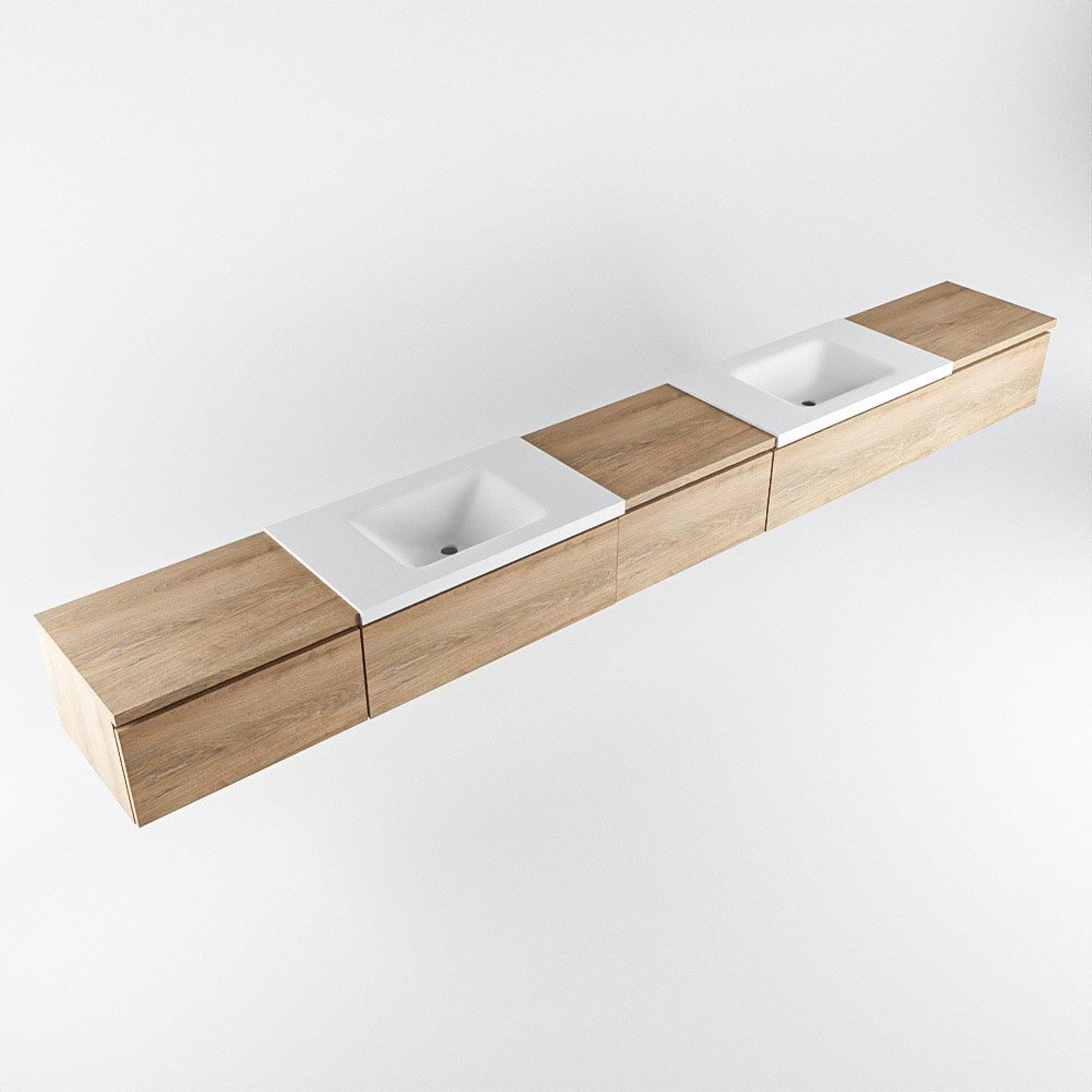 MONDIAZ BUKLA 340cm badmeubel met module 60 kleur Washed Oak met 5 lades. Wastafel CLOUD dubbel 2 kraangaten kleur Talc.
