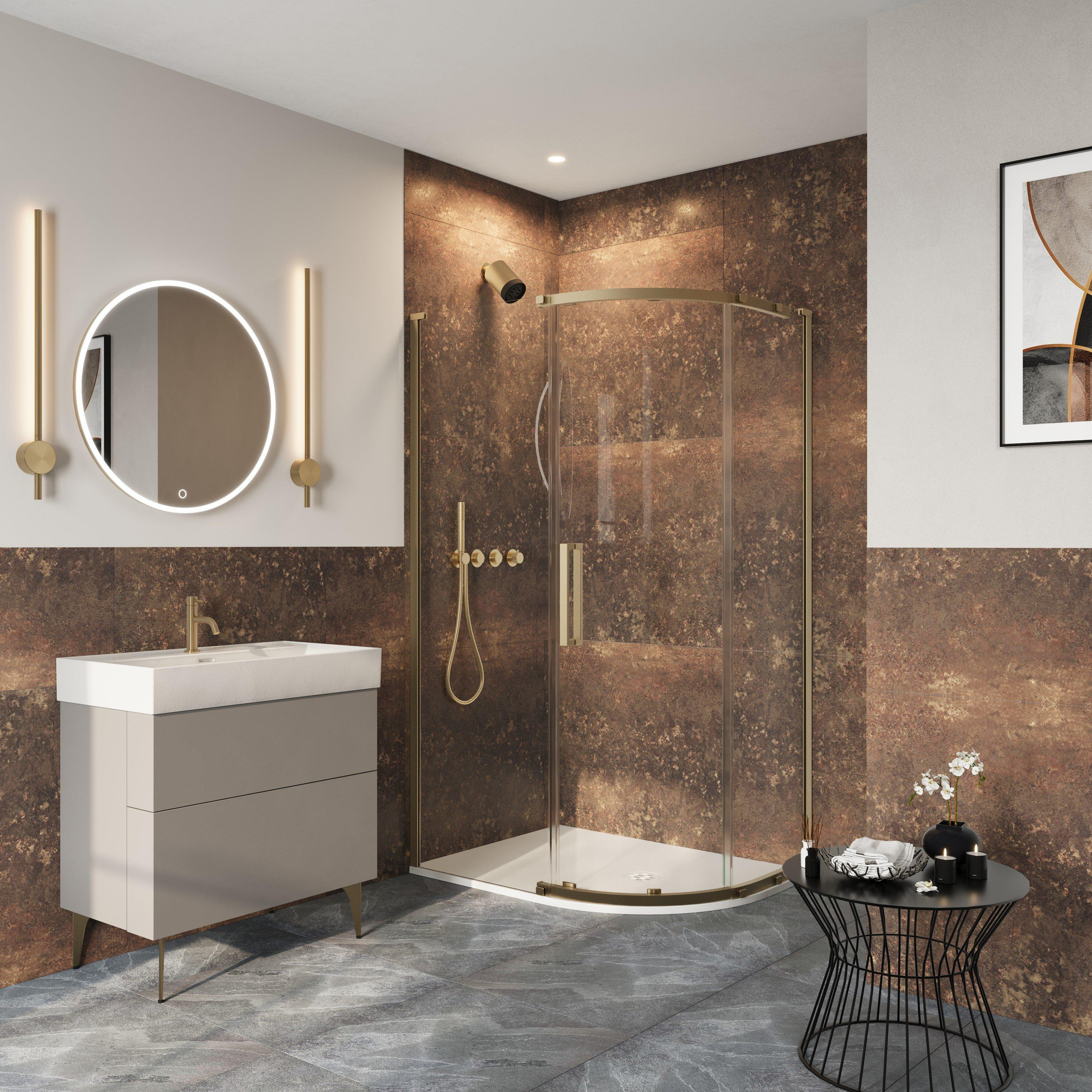 De Crosswater Asura Kwartronde Douchedeur is een veelzijdige toevoeging aan elke badkamer. Of je nu een kleine badkamer hebt die een slimme indeling vereist of een ruime badkamer die een vleugje luxe kan gebruiken, deze douchedeur past perfect. Het geborsteld messing geeft een warme uitstraling aan de ruimte en kan worden gecombineerd met verschillende kleurenschema's en accessoires voor een gepersonaliseerde look.