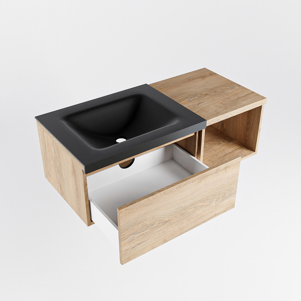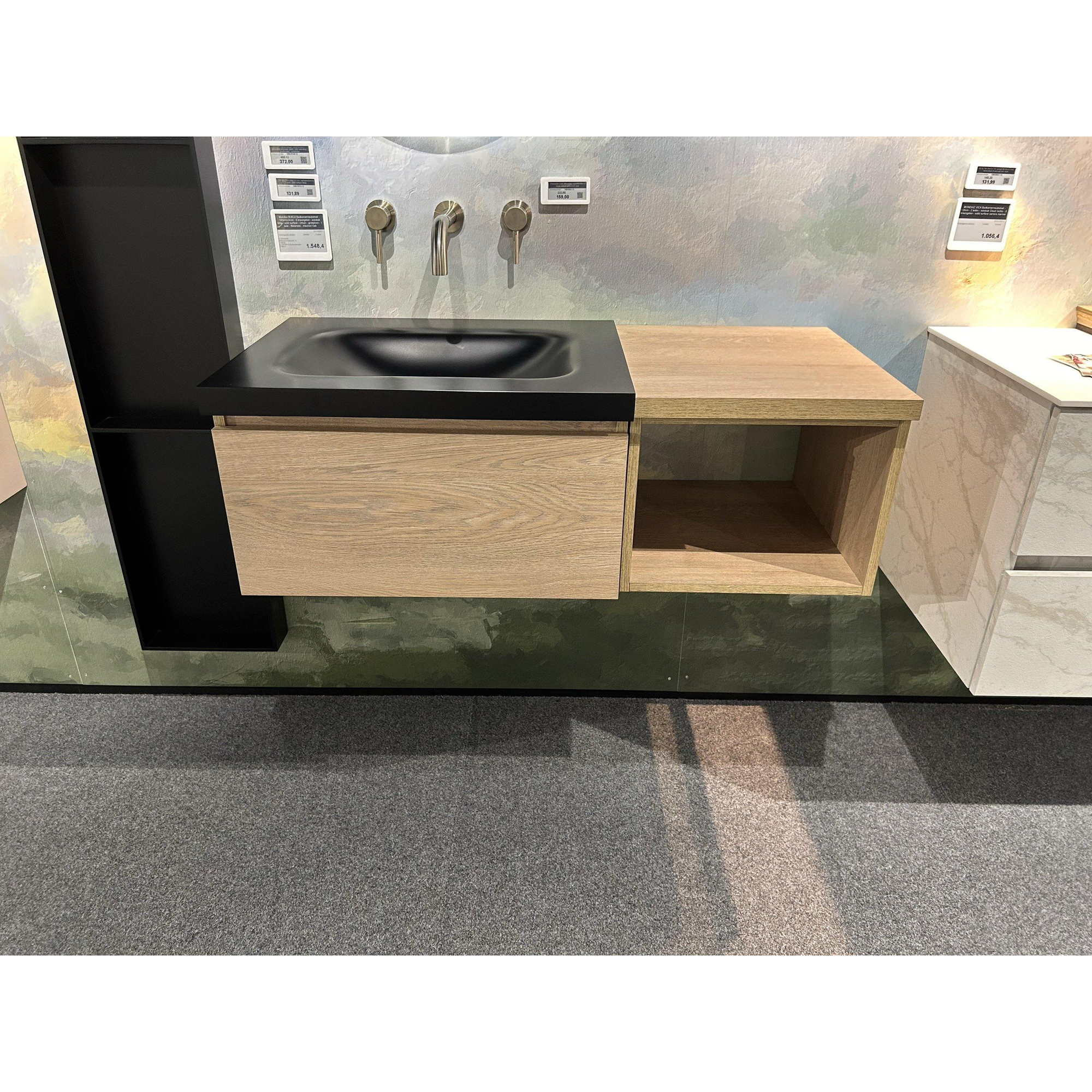Dit prachtige Mondiaz BUKLA badkamermeubelset is een ware aanwinst voor elke badkamer. Met zijn moderne design en hoogwaardige materialen voegt dit meubel niet alleen stijl toe, maar biedt het ook functionaliteit en duurzaamheid. Met een afmeting van 100x45x34cm past dit meubel perfect in zowel kleine als grote badkamers. De wasbak aan de linkerkant, gemaakt van solid surface materiaal in Urban stijl met een greeploos ontwerp, straalt elegantie uit. De enkele lade biedt voldoende opbergruimte en is afgewerkt met Melamine in de prachtige kleur Washed Oak.